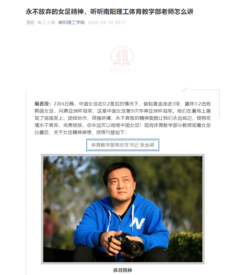 寒假中,利用女足亚洲杯夺冠的契机,部党总支书记张金梁、副主任顾长海和8位教师一道撰写“永不放弃的女足精神,听听南阳理工2138CC太阳集团老师怎么讲”专题新闻稿,为广大师生阐述女足精神里边蕴含的课程思政内容;开学前党总支书记张金梁和徐驰、刘晓亮制作“新学期新气象—南工体育第一课”,利用学生喜闻乐见的抖音快闪模式作为切入点,为大家讲述女足姑娘的顽强拼搏;开学后,利用第一节体育课时间,部党总支书记张金梁带领徐驰、顾浩正两位老师结合实际组织学生开展“冬奥”之约,通过旱地短道速滑、“超级变变变”模仿奥运图标等趣味比赛,让学生在锻炼中体验到“勇于超越自我,争做最好自己”的冬奥精神。