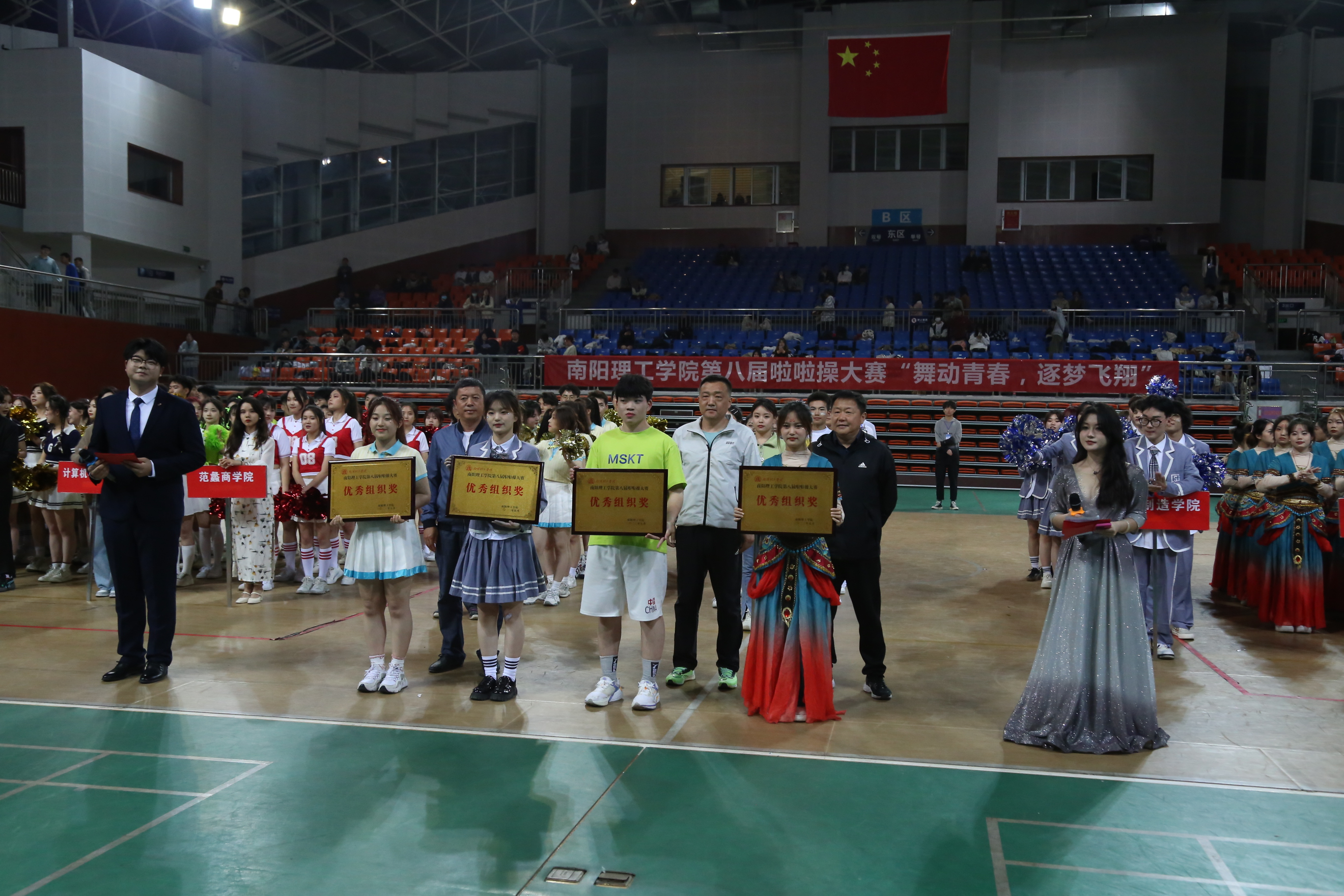 开幕式结束后,各学院代表队按照事先抽签所定顺序,依次出场进行比赛。比赛中,参赛队员身着服装整齐,身姿律动,动作优美,充分展现出当代大学生青春与活力。精彩的表演赢得了阵阵喝彩,带给现场观众完美的视听享受。经过激烈的角逐,共十三支队伍获奖,其中传媒学院荣获特等奖,数理学院、外国语学院荣获一等奖,范蠡商学院、张仲景国医国药学院、生物与化学工程学院荣获二等奖,土木工程学院、信息工程学院、数字媒体与艺术设计学院荣获三等奖,计算机与软件学院、建筑学院、智能制造学院、教师教育学院荣获优秀奖。