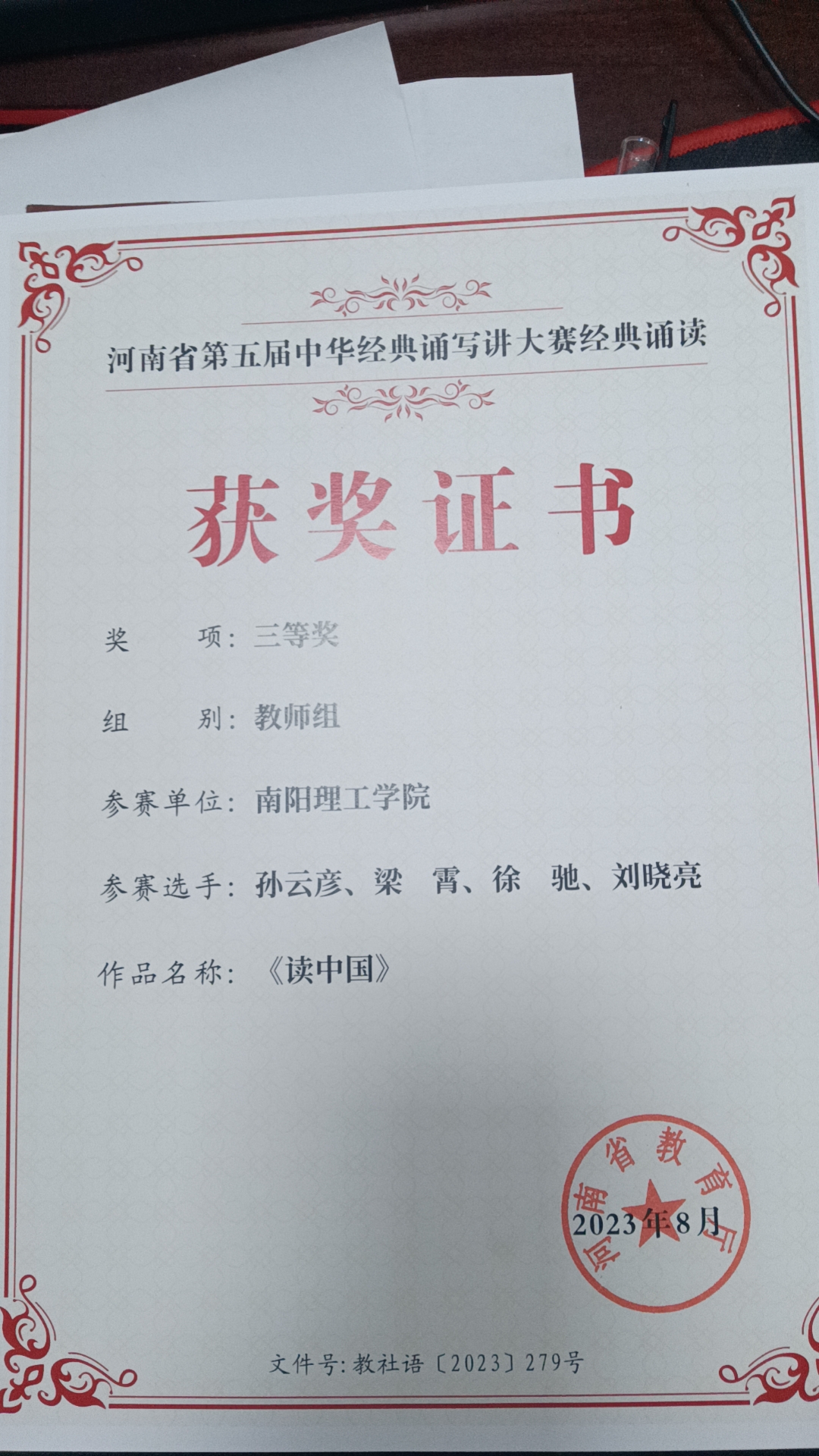近日,由河南省教育厅组织的第五届中华经典诵写讲大赛落下帷幕,我部教师孙云彦、梁霄、徐驰、刘晓亮诗朗诵作品《读中国》荣获三等奖。