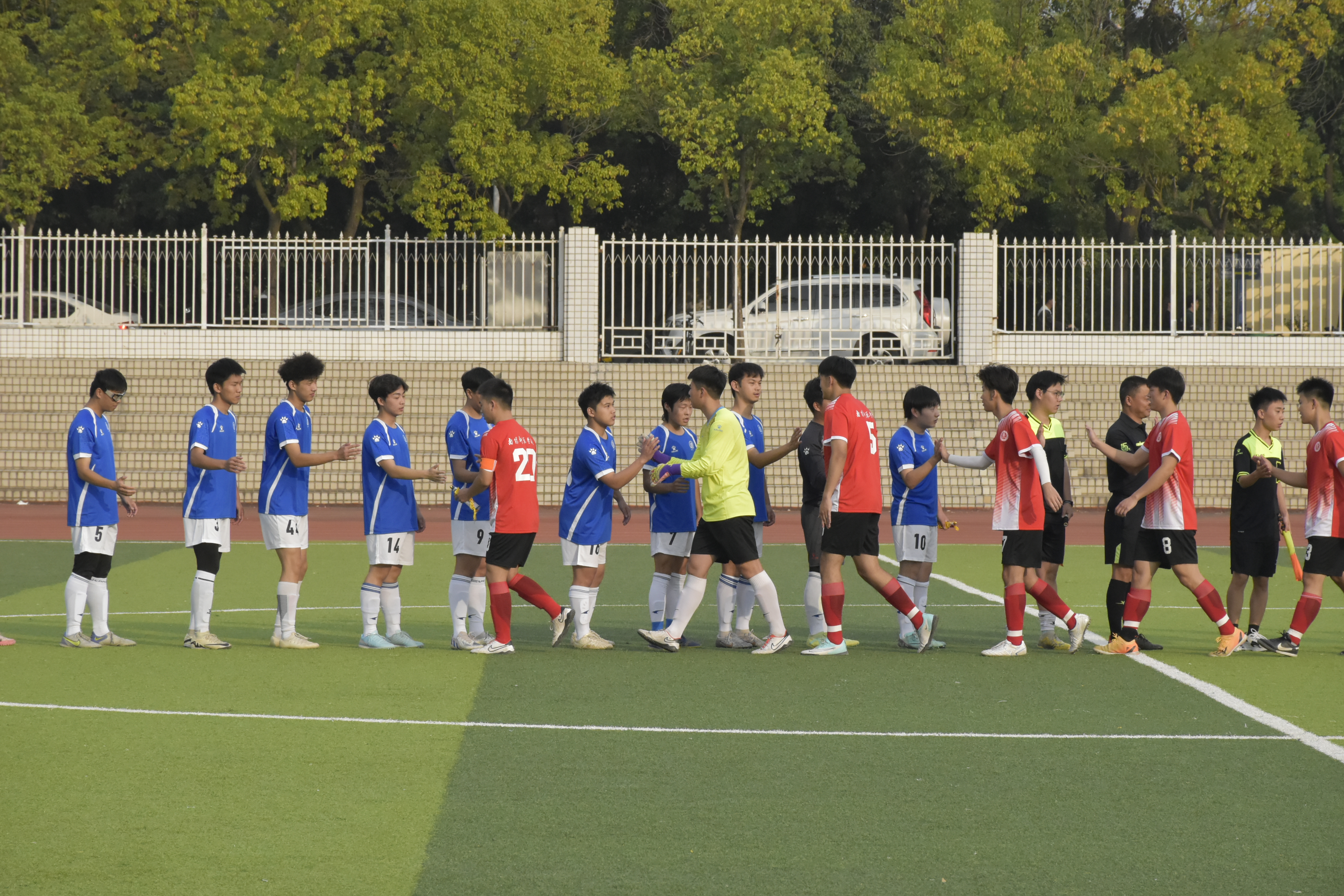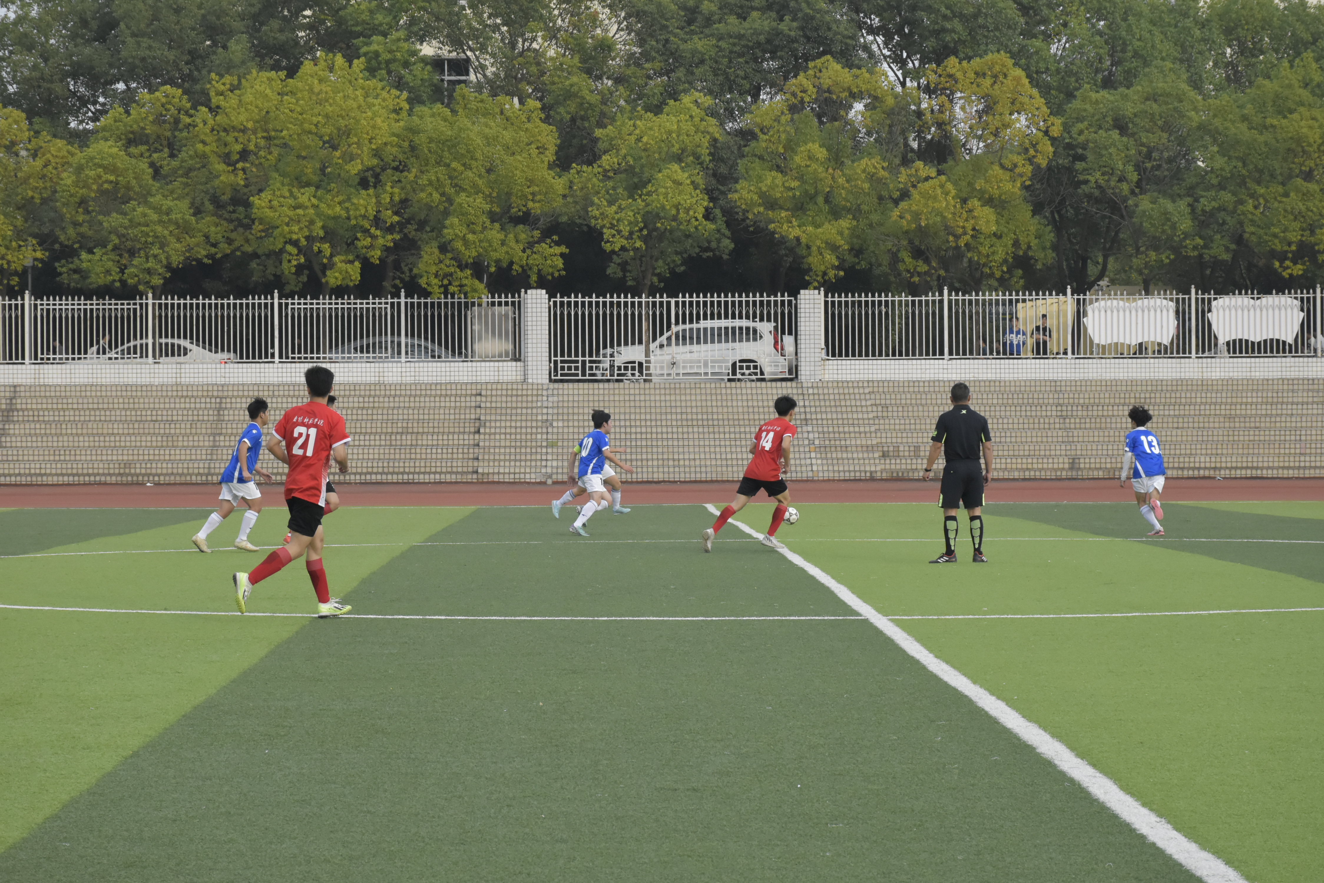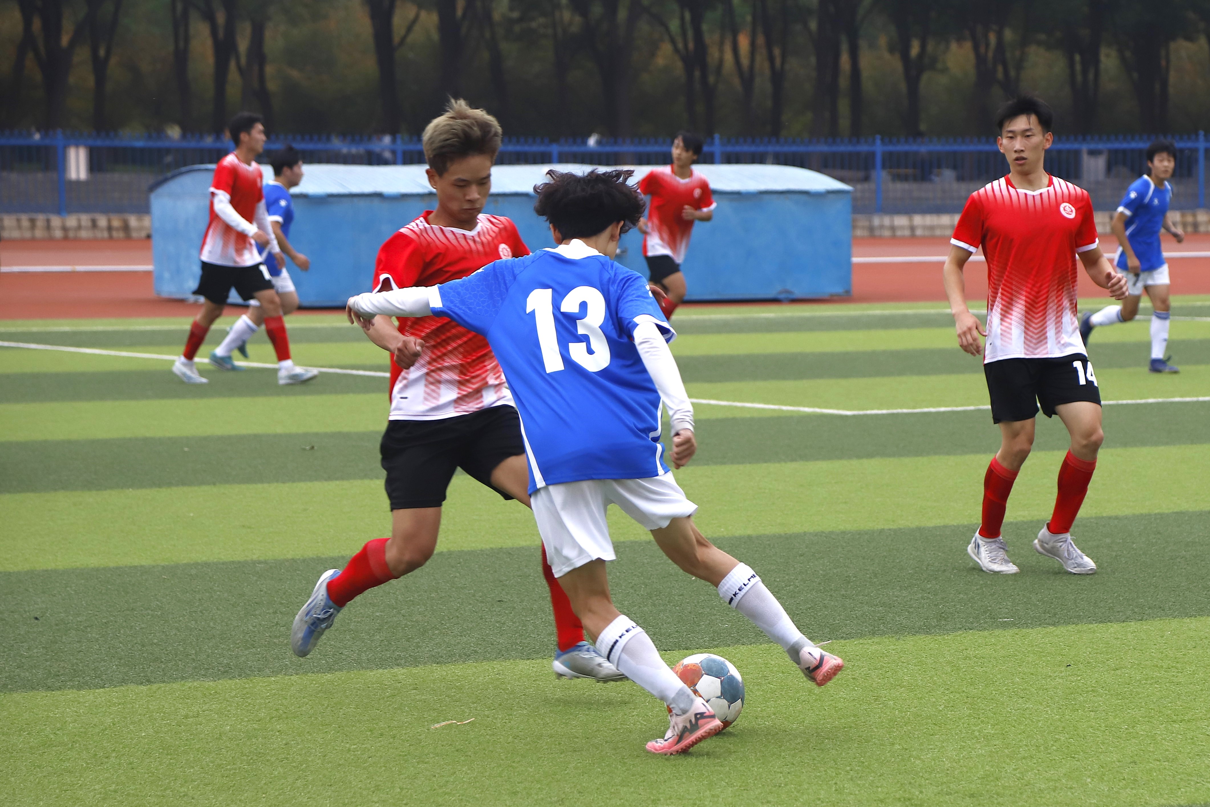 比赛双方分别为我校男子足球队与南阳师范学院男子足球队。赛场上,两支队伍攻守交替、防守严密、配合流畅,展现出高超的球技和顽强的斗志,精湛的球技博得现场观众阵阵掌声、欢呼声。
